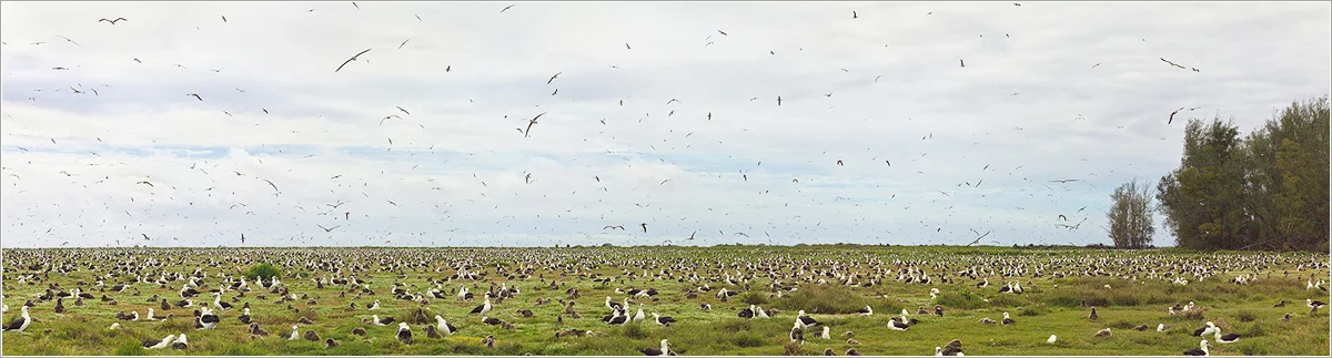 On our second trip to Midway, the project's focus began to evolve, as we met the live albatrosses singing and dancing by the hundreds of thousands all over the island. Returning to Midway a total of eight times over four years, we experienced the birds' beauty, grace, and sentience more and more vividly with each trip. We learned to attune ourselves to their body language, so that we could film them up close without causing them anxiety. They allowed us to witness their most tender moments at astonishingly close range, as the mated pairs snuggled and built their nests together, their babies hatched from their eggs, and the fluffy chicks waited alone for their parents to return from their foraging trips to sea. The poetry of the albatross revealed itself layer by layer, as my team and I were gifted with intimate footage of every stage of their cycles of life, death, and birth.
